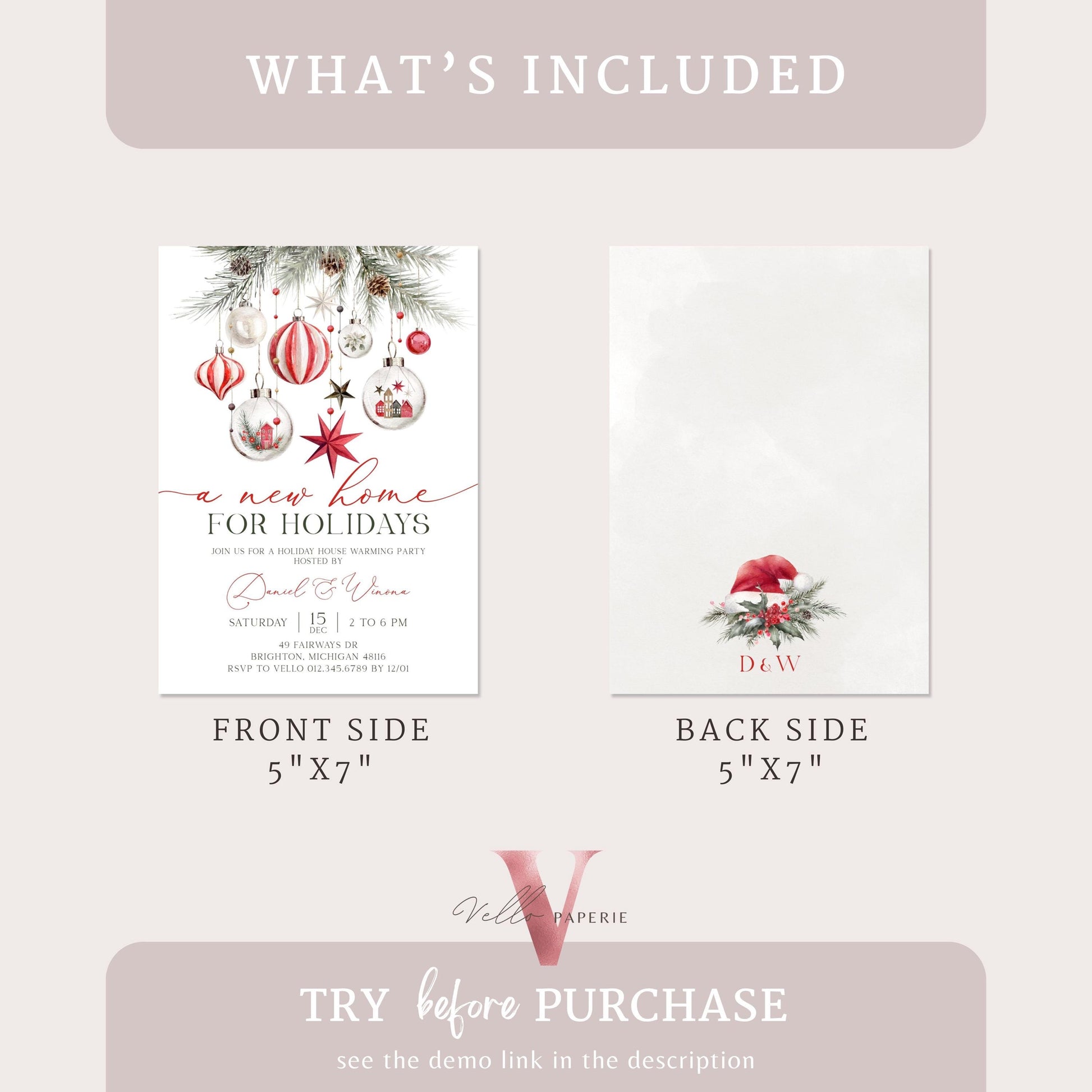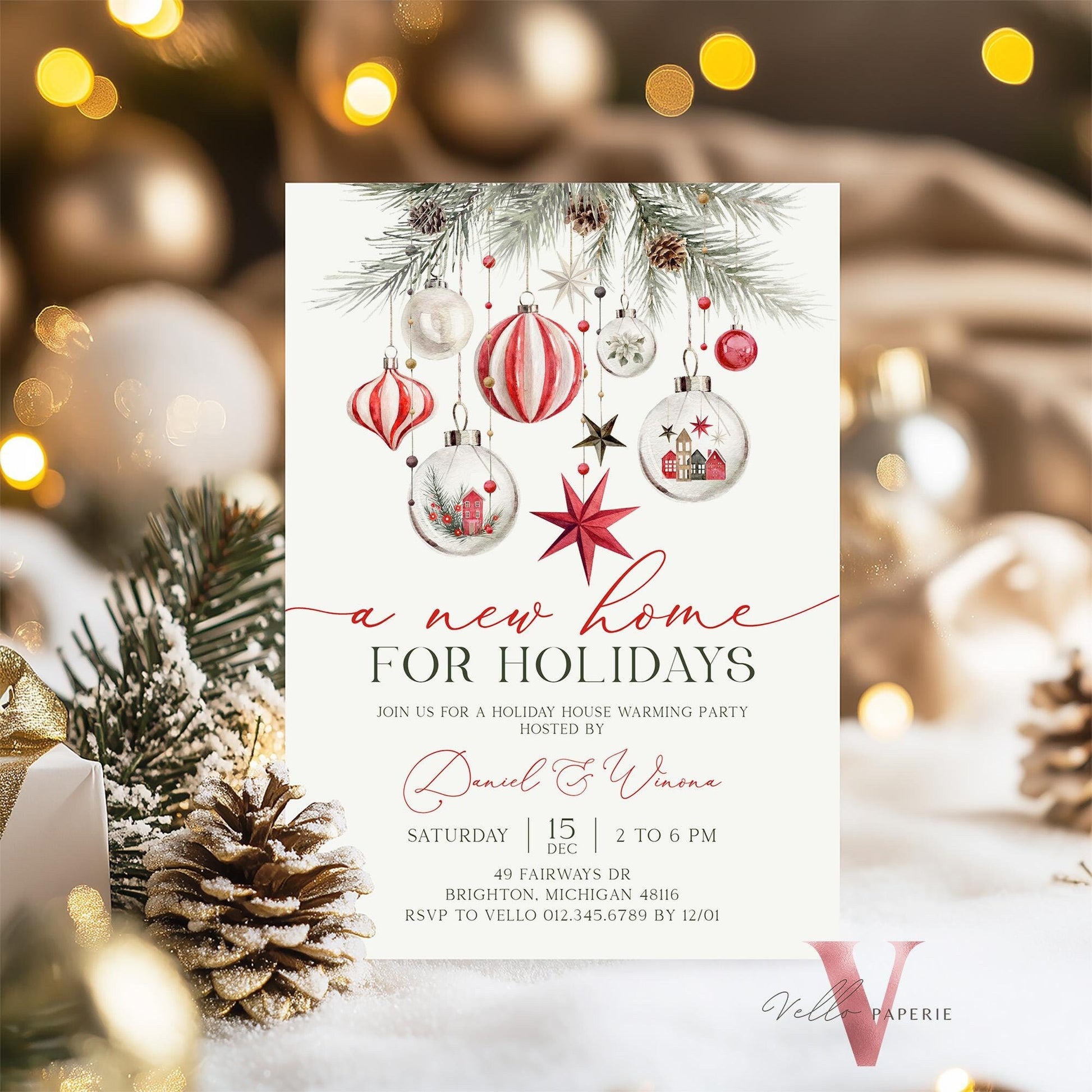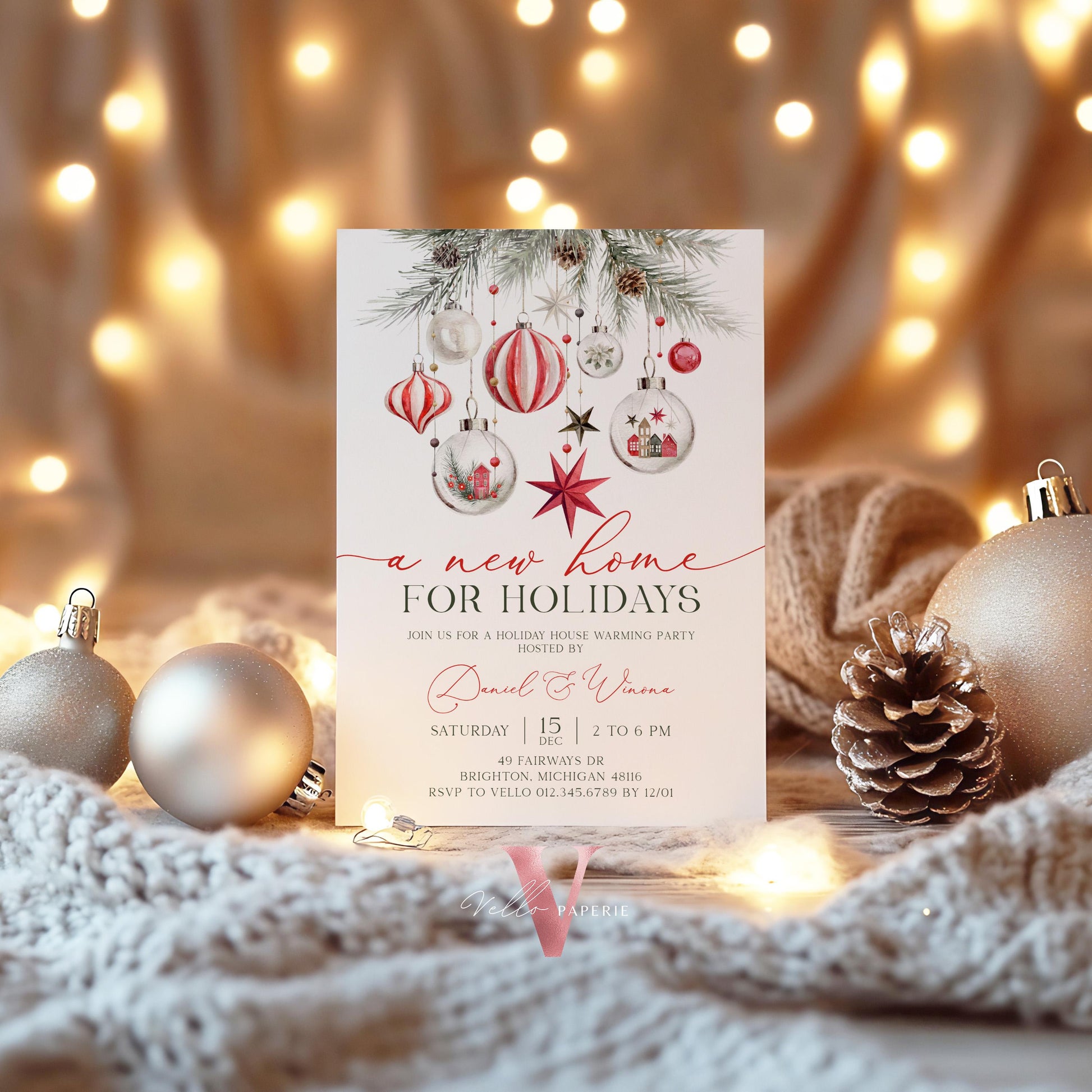 Christmas House Warming Invitation | Red Silver Home Sweet Home Party Invite | Modern/Rustic New House Celebration Winter Floral Decor WHW01