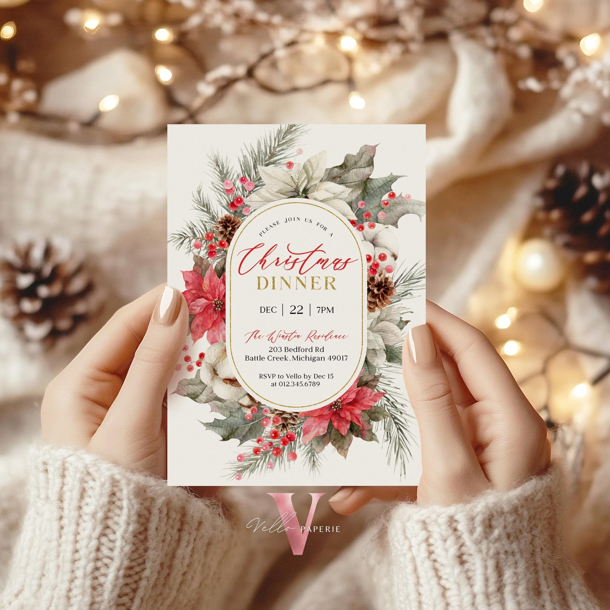 Classic Floral Christmas Dinner Invitation | Neutral Christmas Open House Invite | Modern or Rustic Red Winter Flower Friendsmas Party CHP01