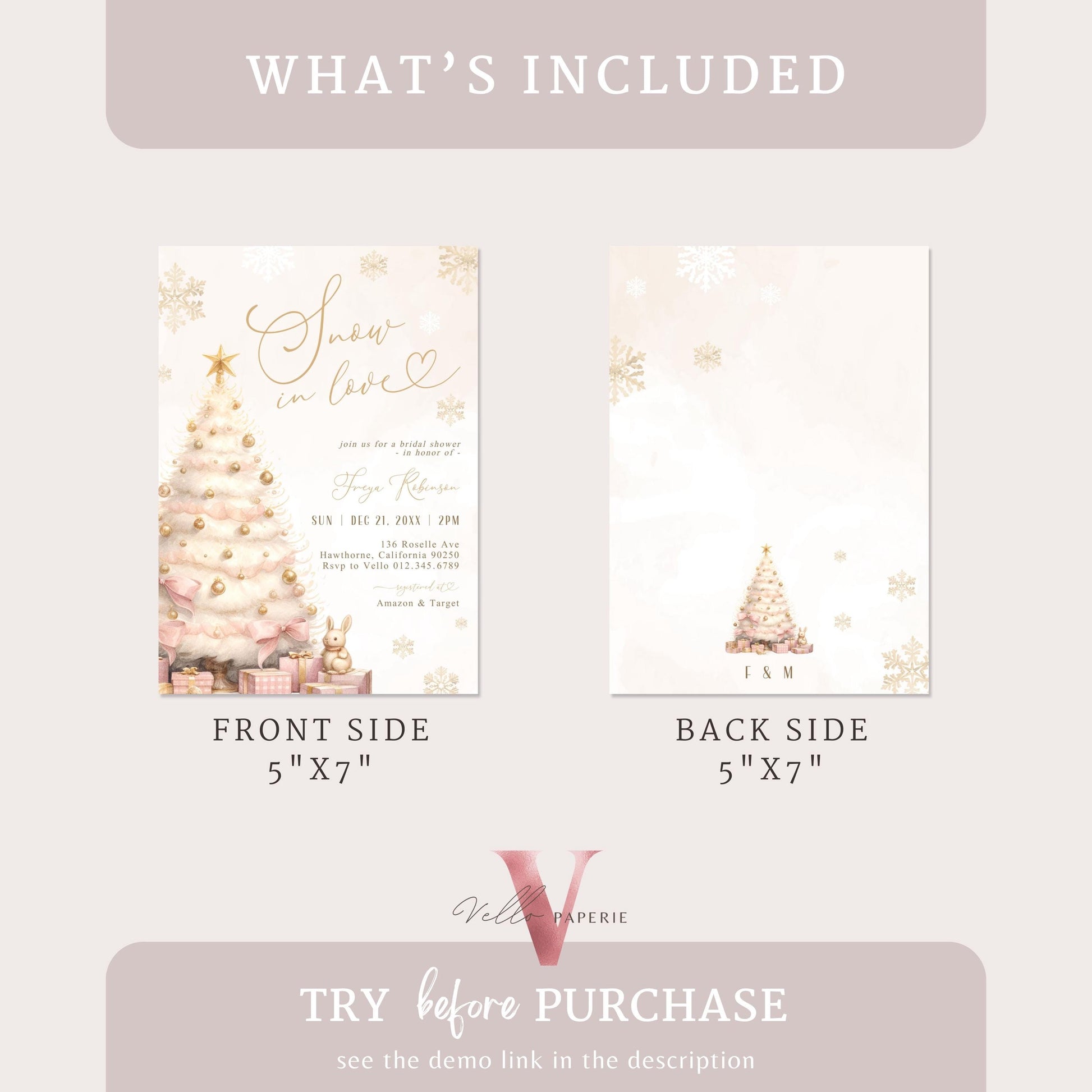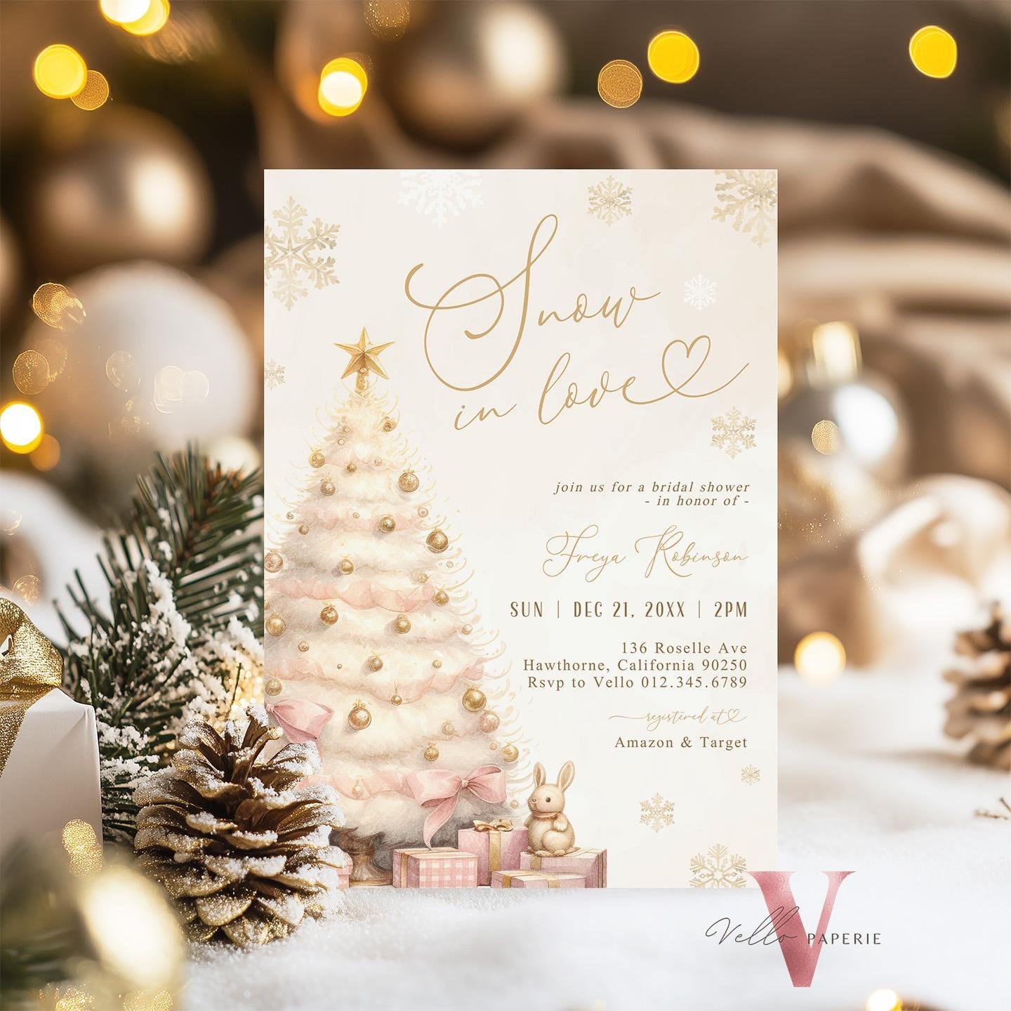 Coquette Blush Pink SNOW in LOVE Bridal Shower Invitation | Winter Snowflakes Gold Christmas Tree Bride to Be, Couple Wedding Shower WBD01
