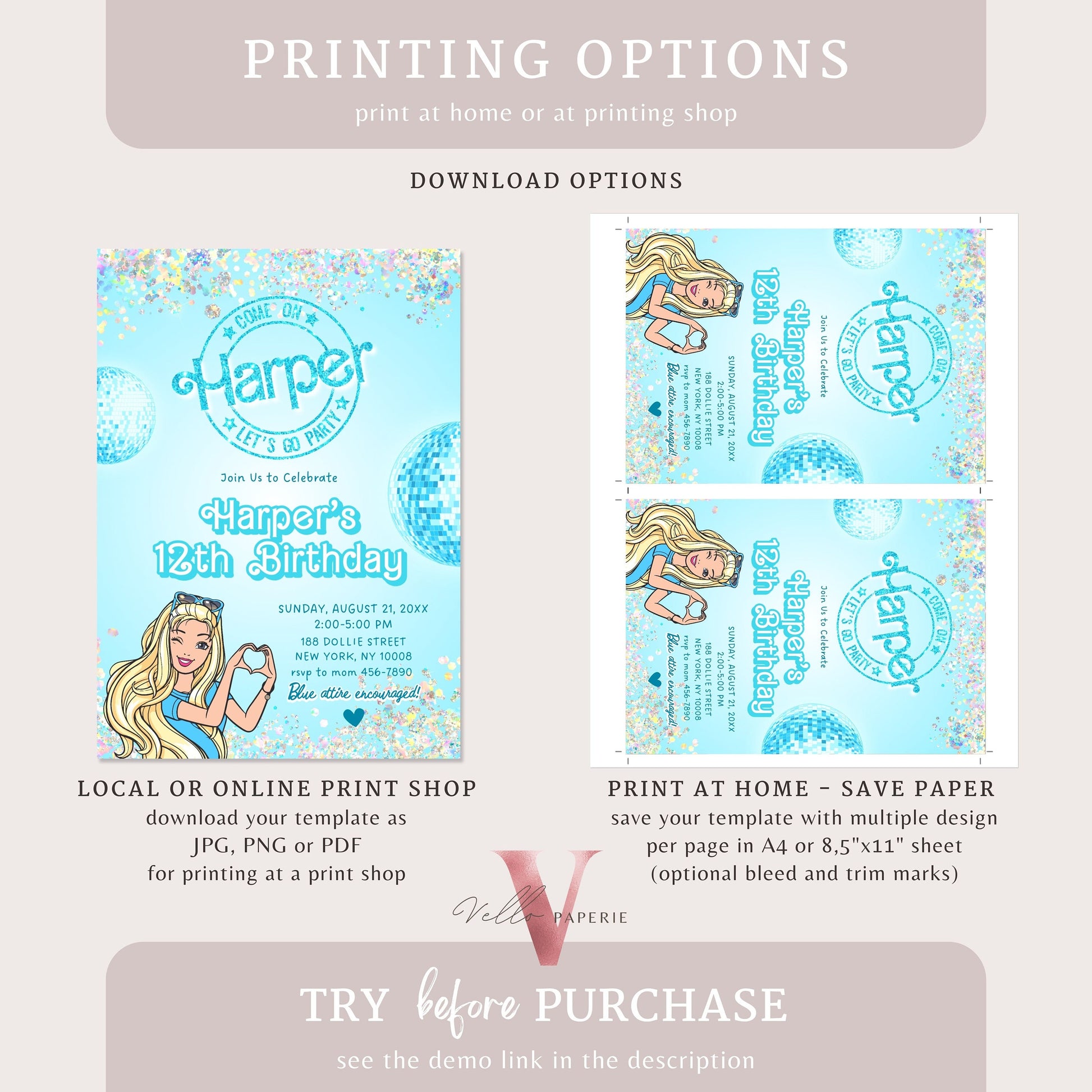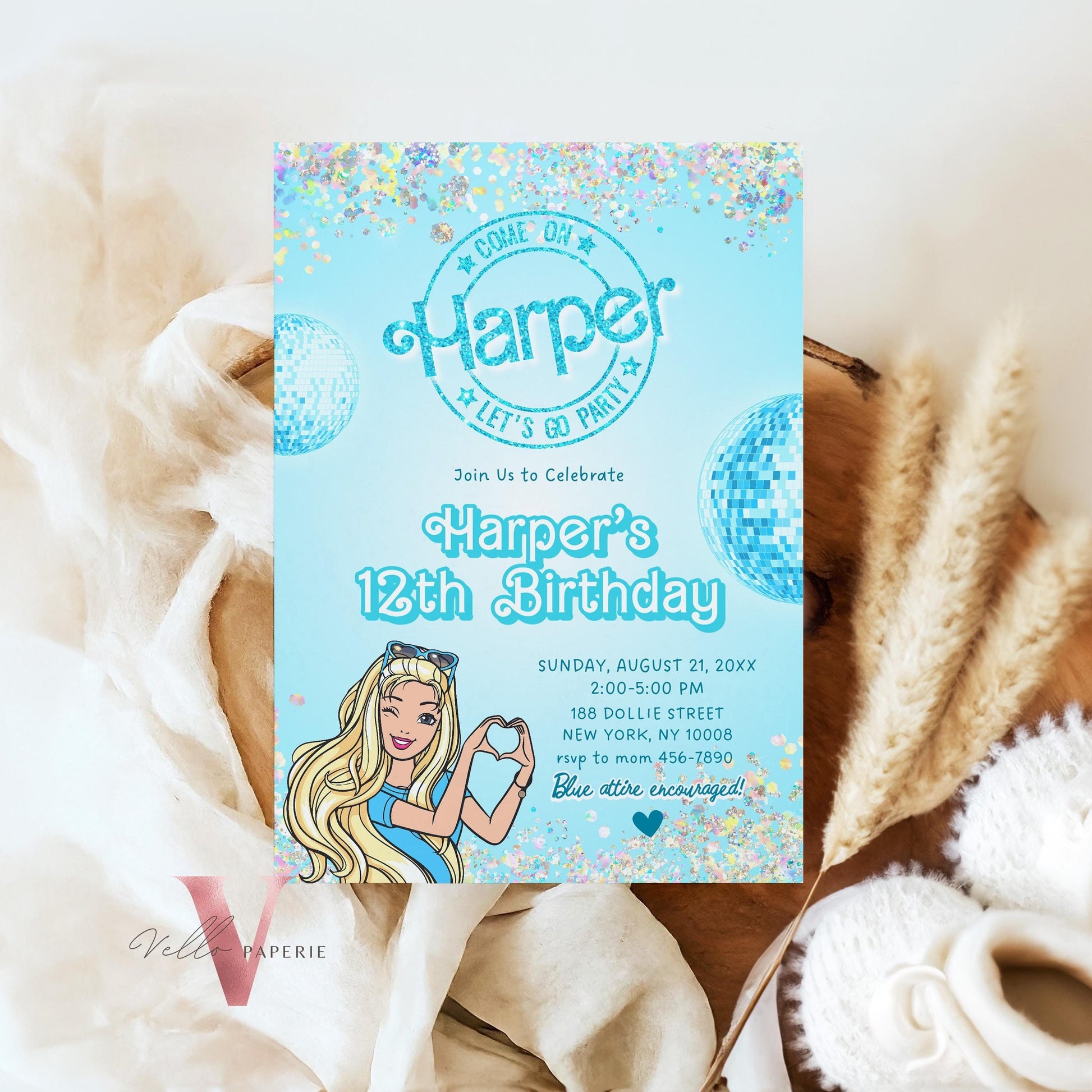 Disco Blue Doll Birthday Invitation | Editable Printable Glitter Blue Disco Party Invite | Boy and Girl Blue Doll Party Instant Download