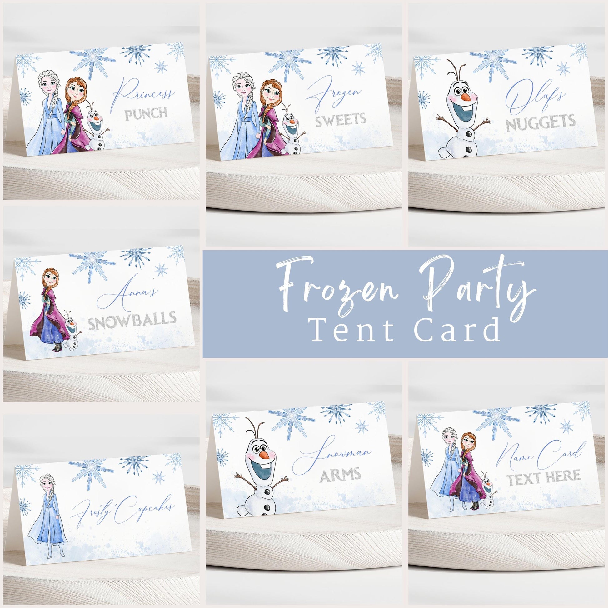 Editable Printable Any Age Frozen Birthday Tent Card | Glitter Silver Snow Princess Anna Elsa Party Table Card, Name Label, Food Label FBP01