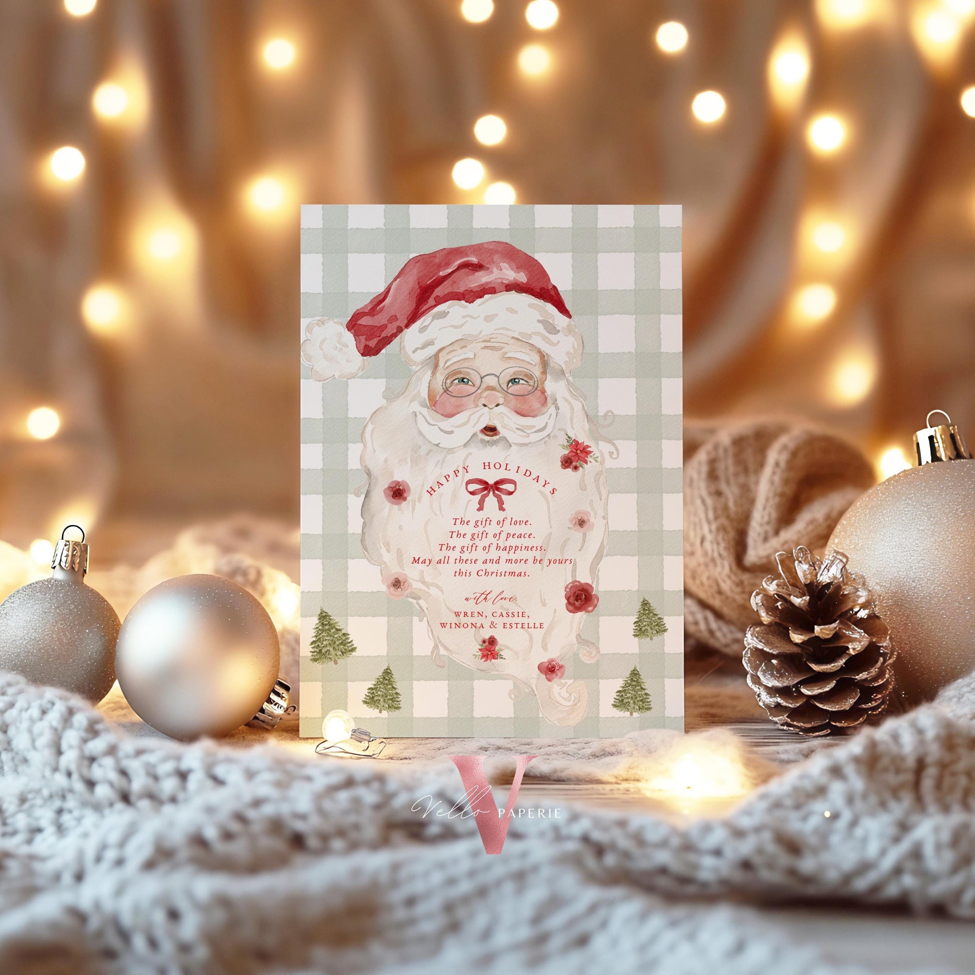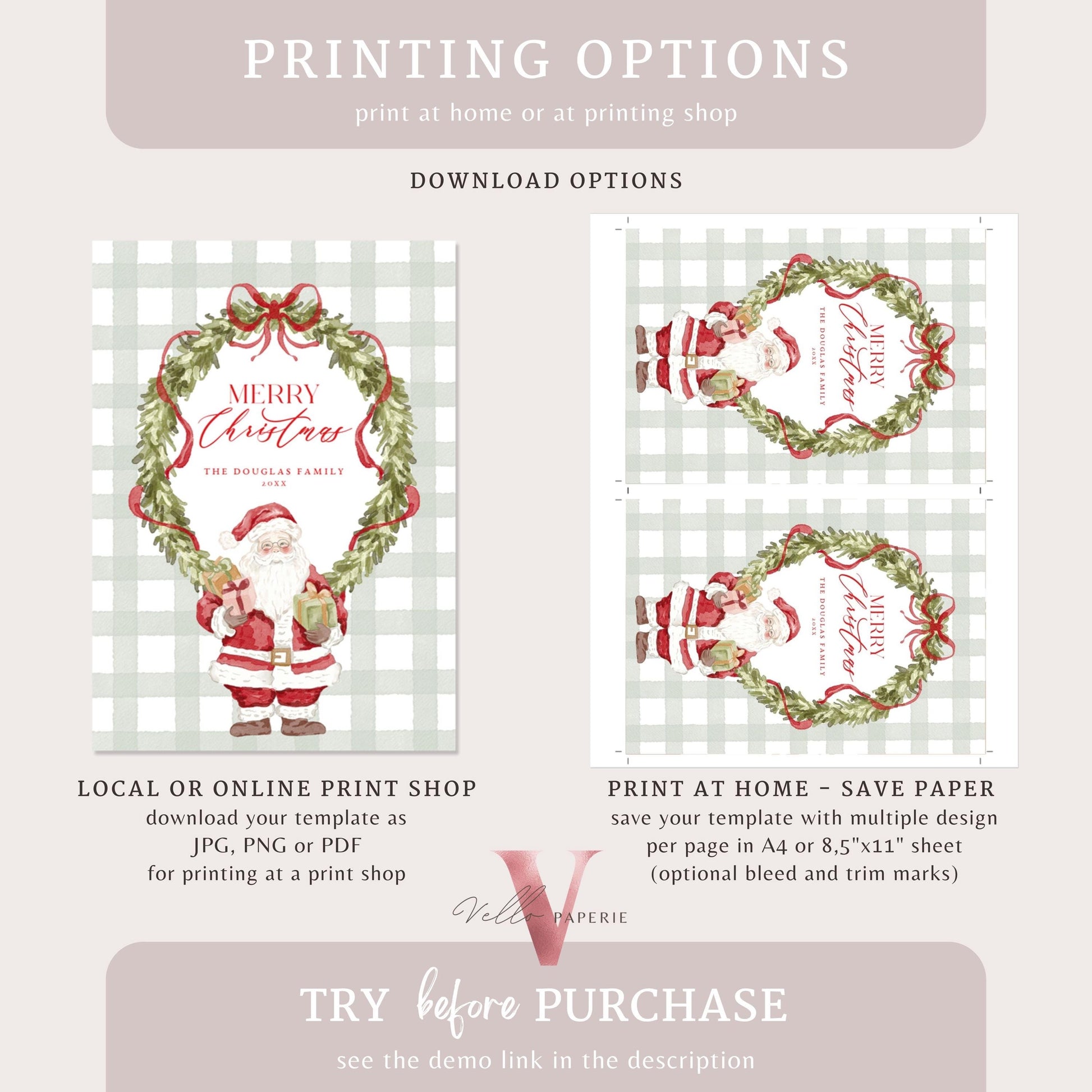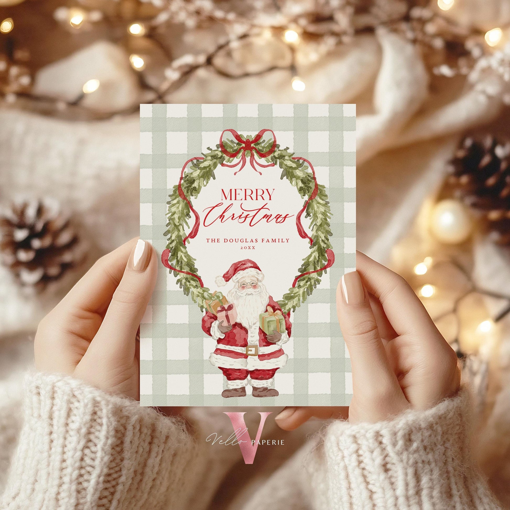Editable Printable Grandmillenial Christmas Greetings Card | Watercolor Merry Christmas Card Template | Santa and Wreath Holiday Card BCPF1
