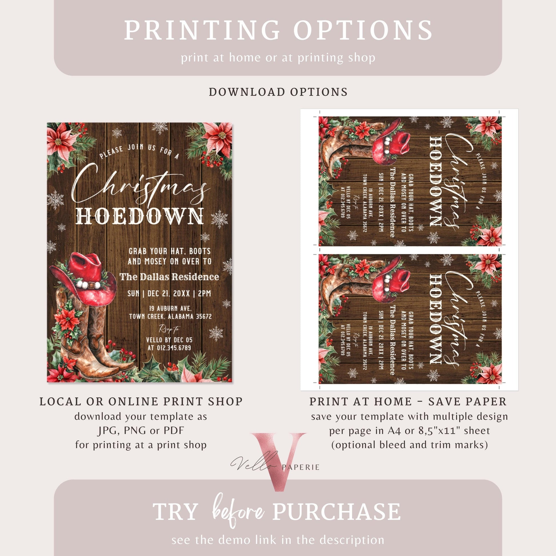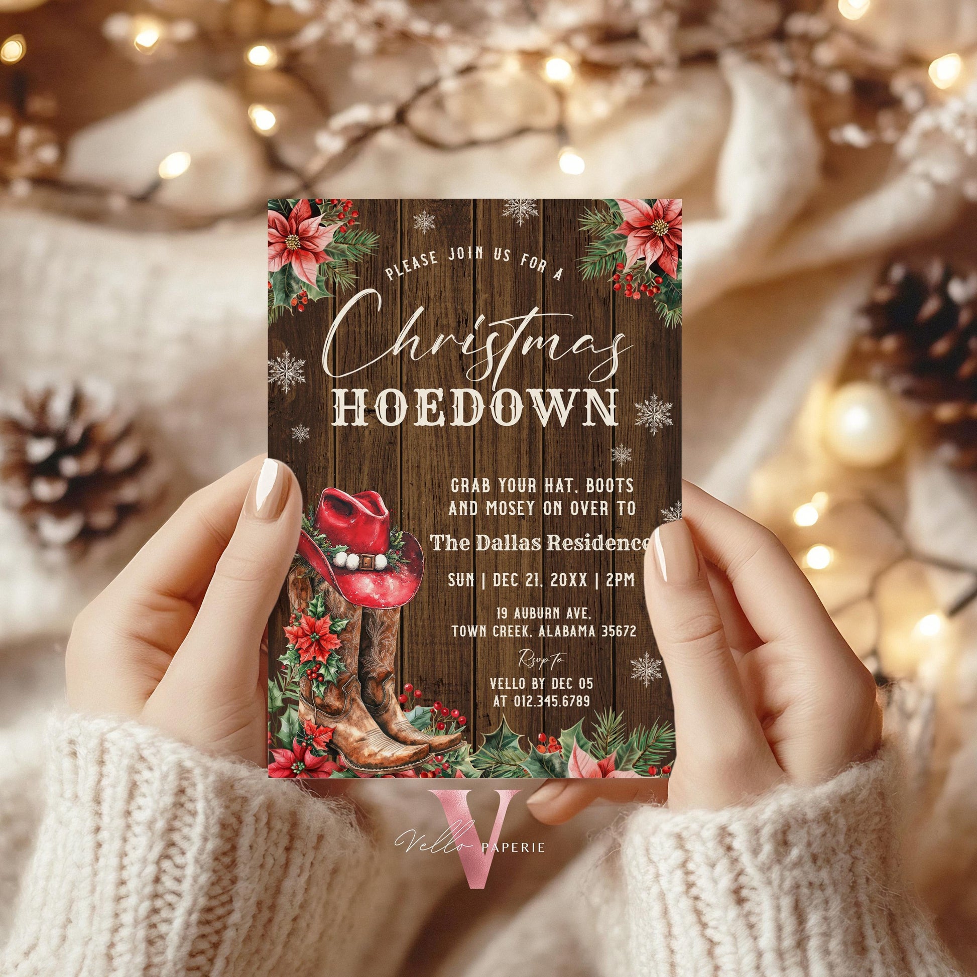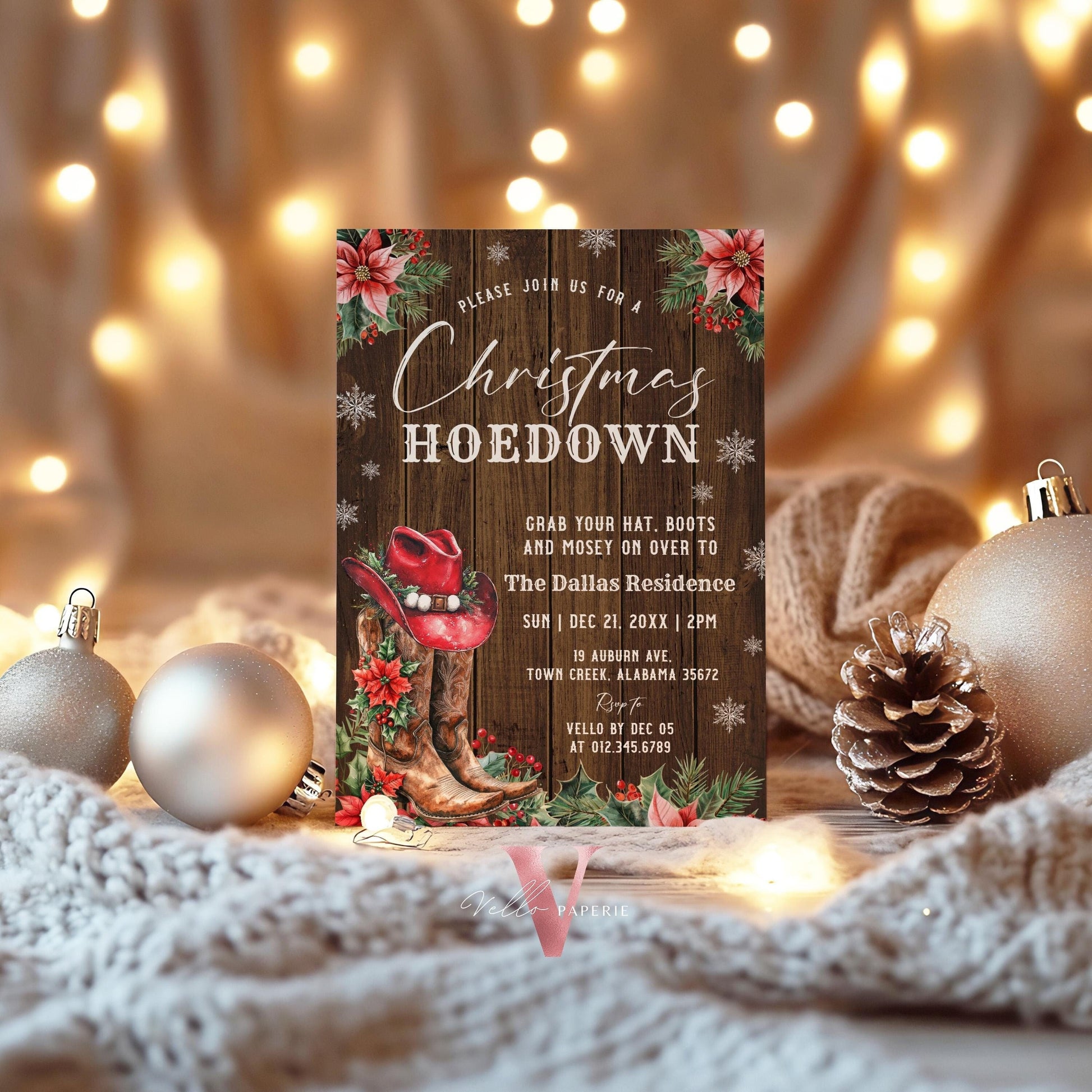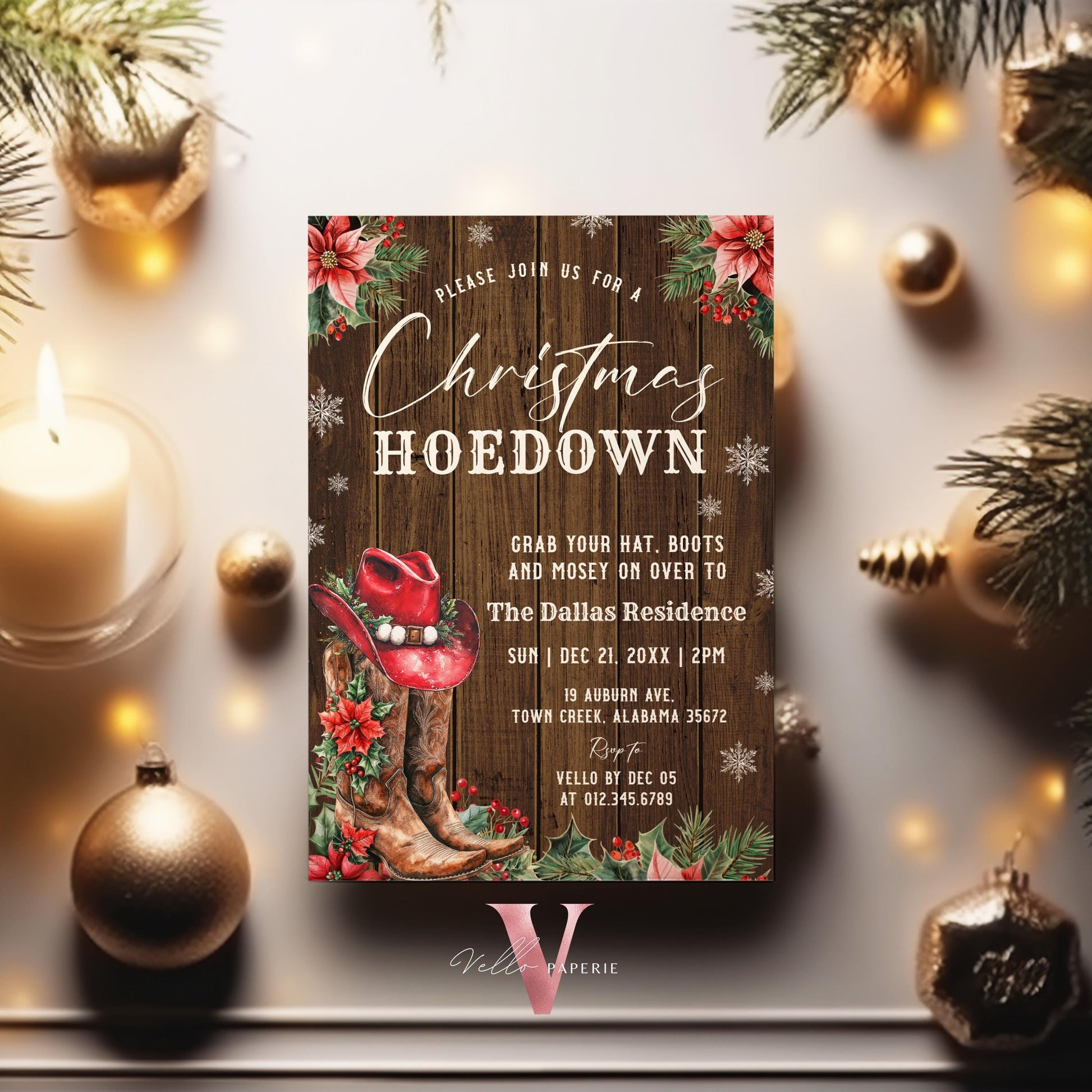 Editable Western Christmas Hoedown Party Invitation | Merry Little Open House Cowboy Holiday Party Invite | Rustic Boots Friendsmas WCH01