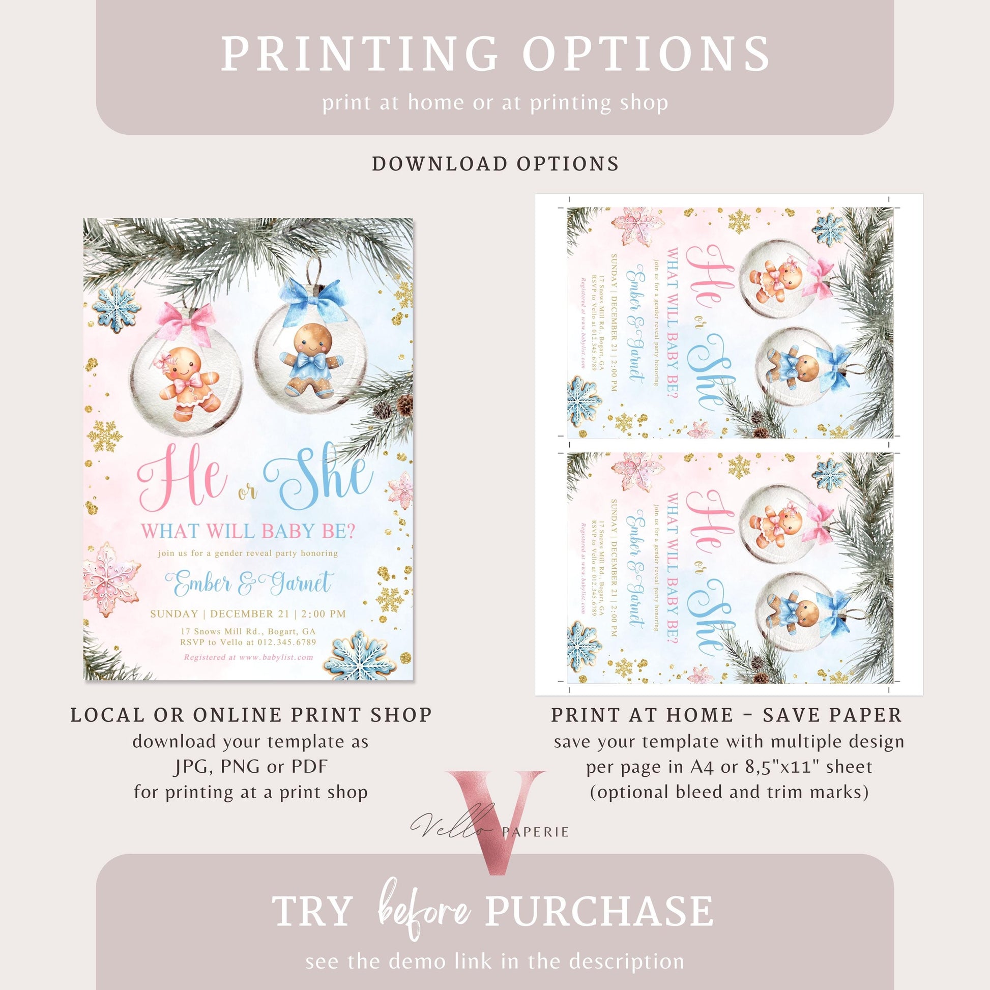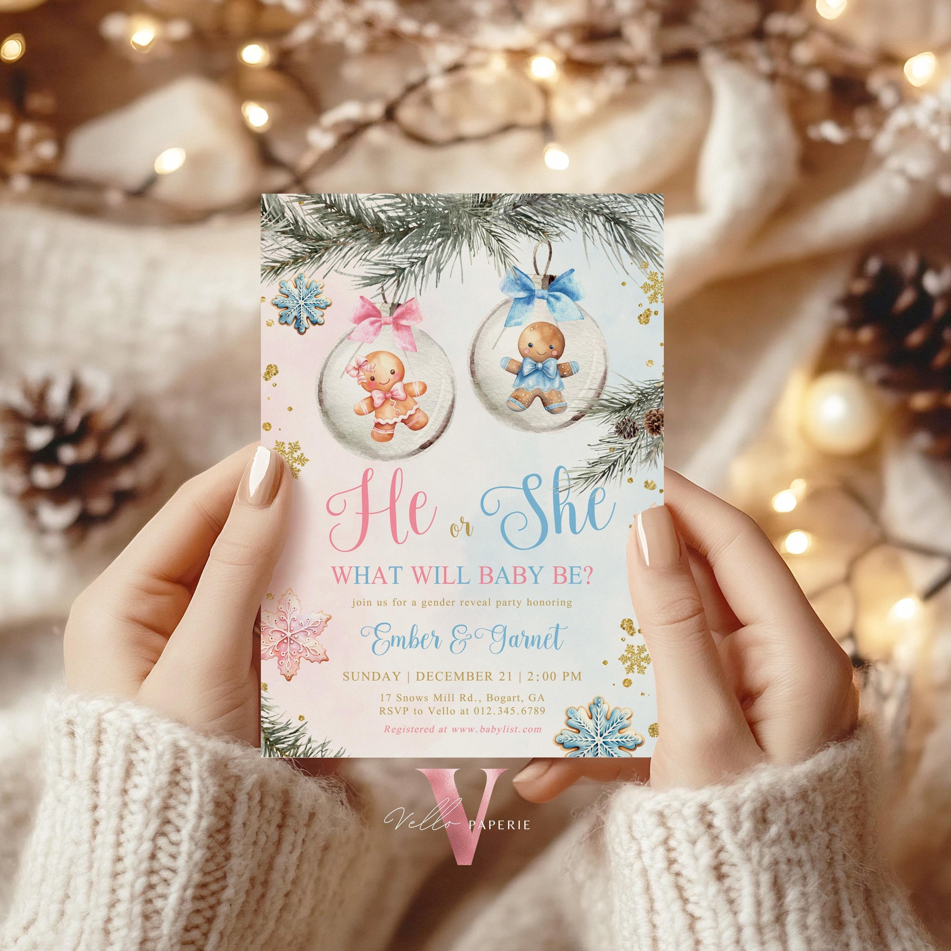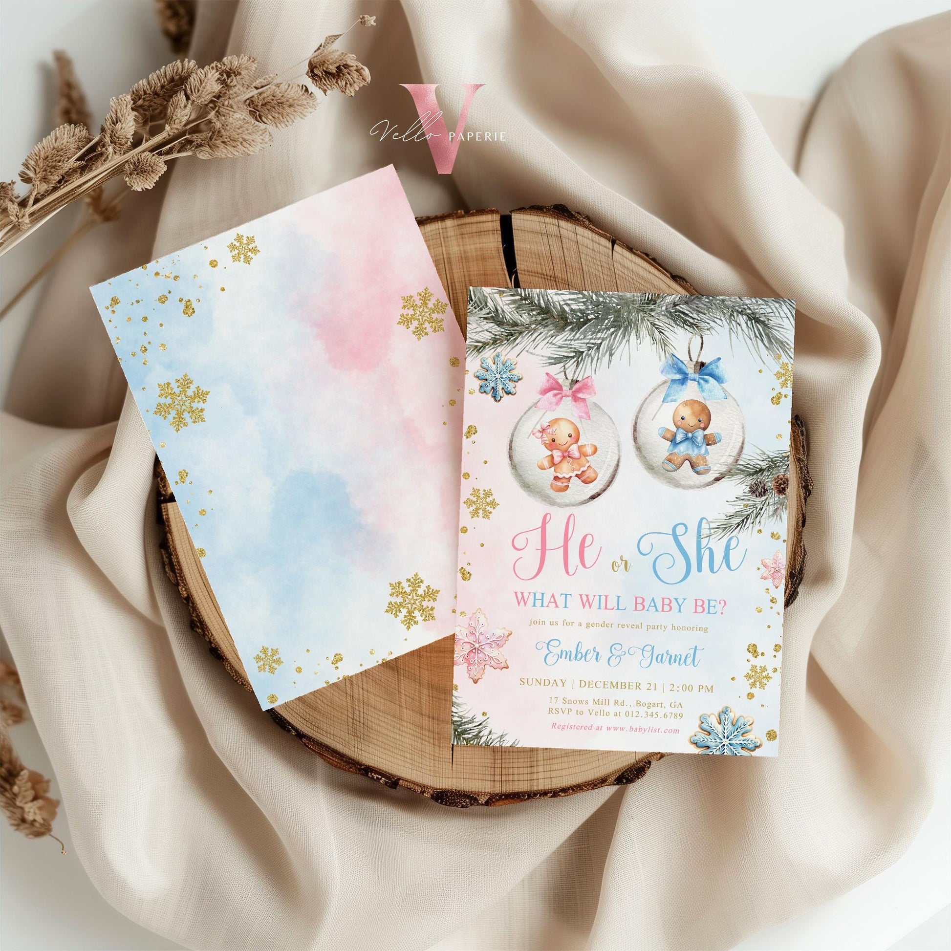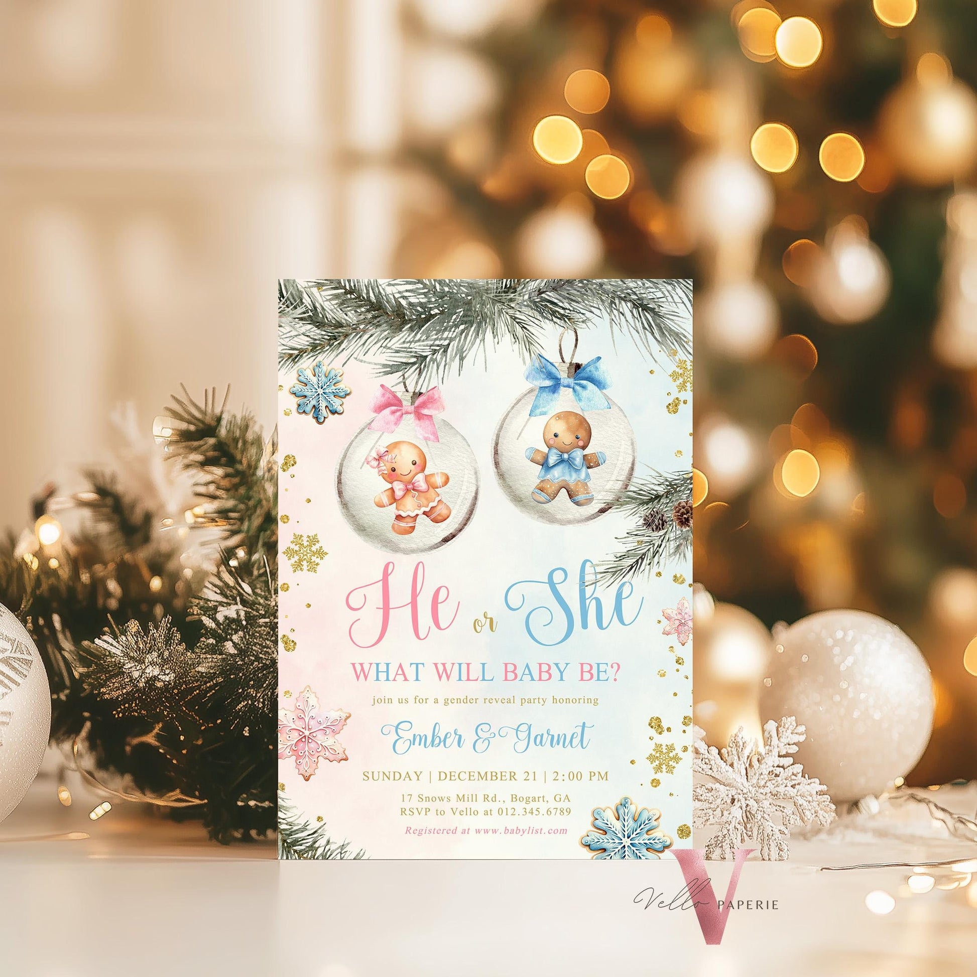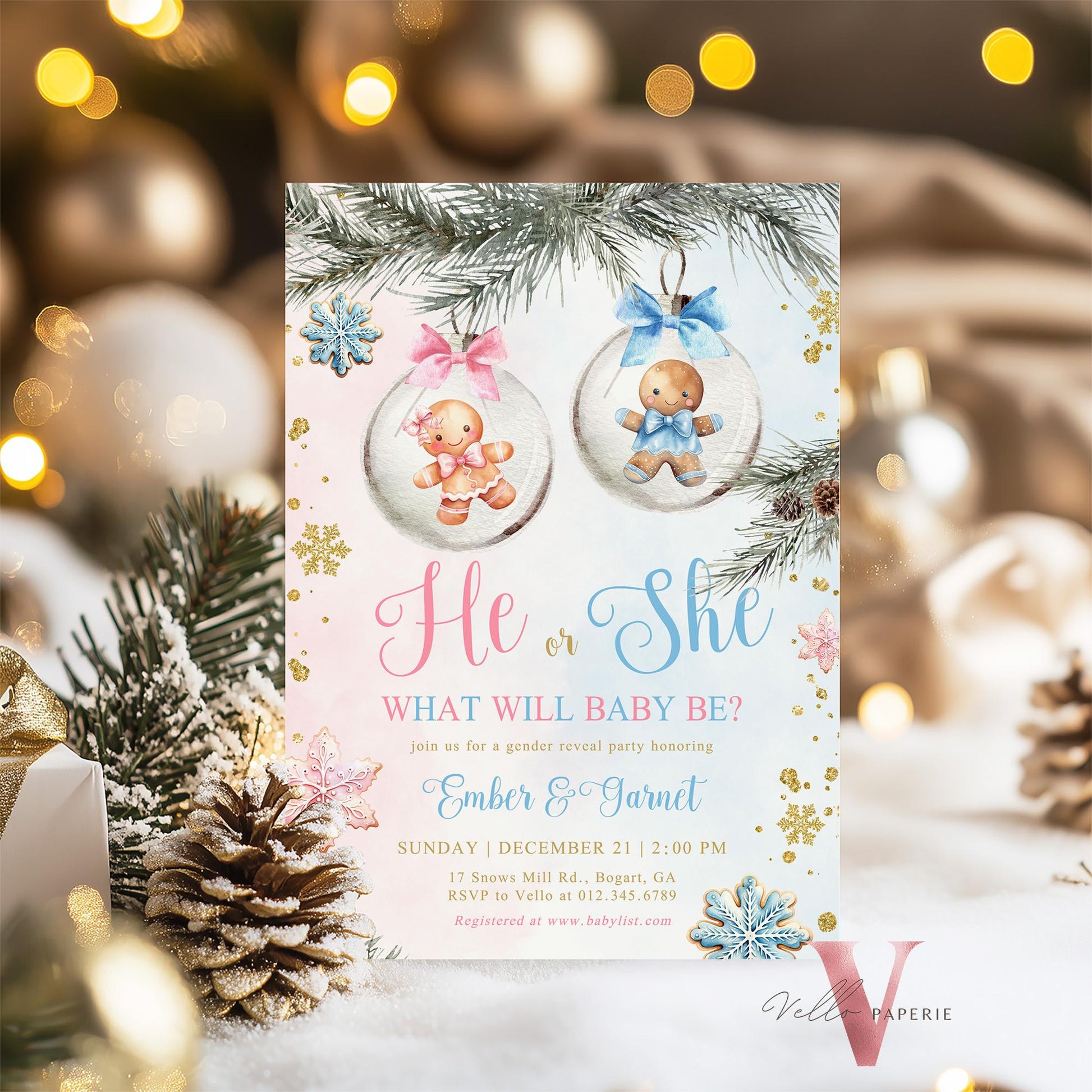 He or She Gingerbread Baby Shower Invitation | Winter Gender Reveal Cookie Baby Invite | Pink Blue Gold Gingerbread Christmas Bauble CWBS01