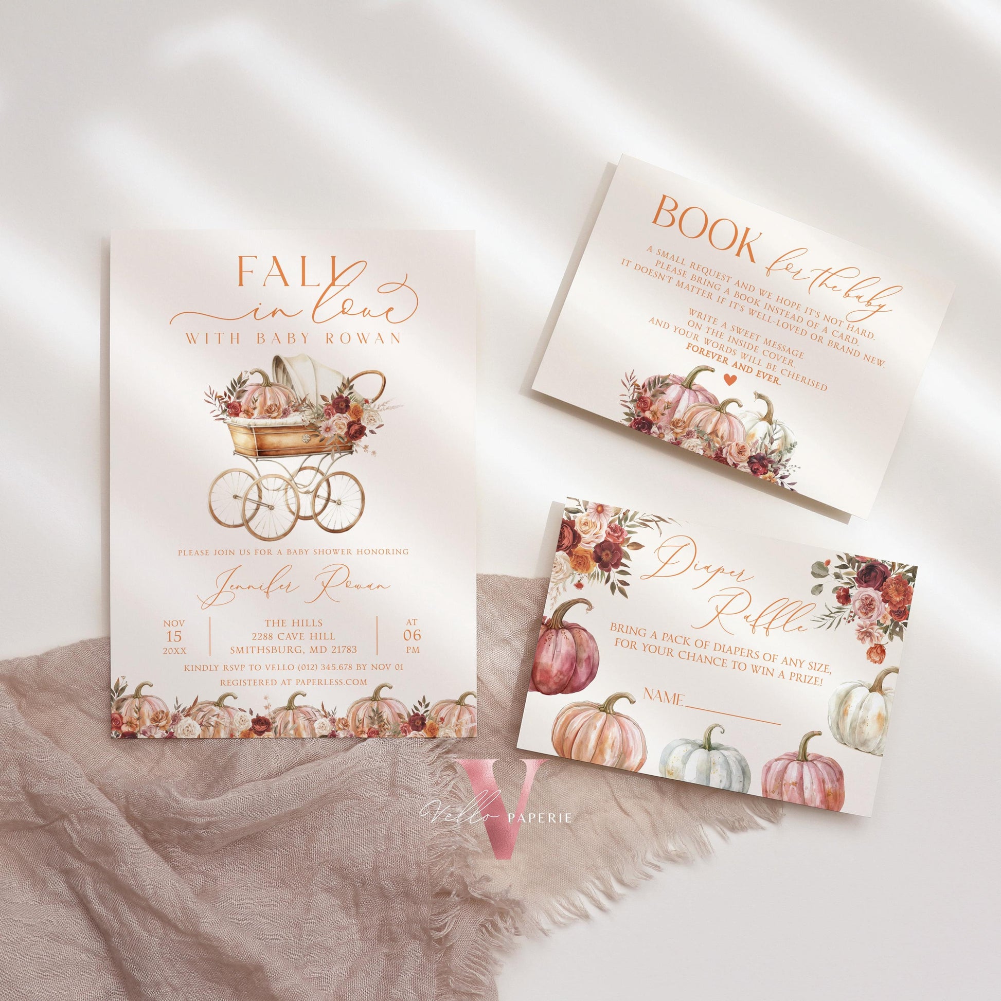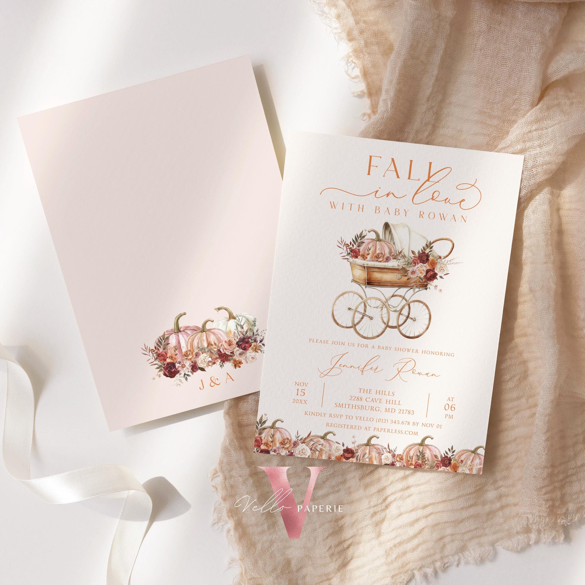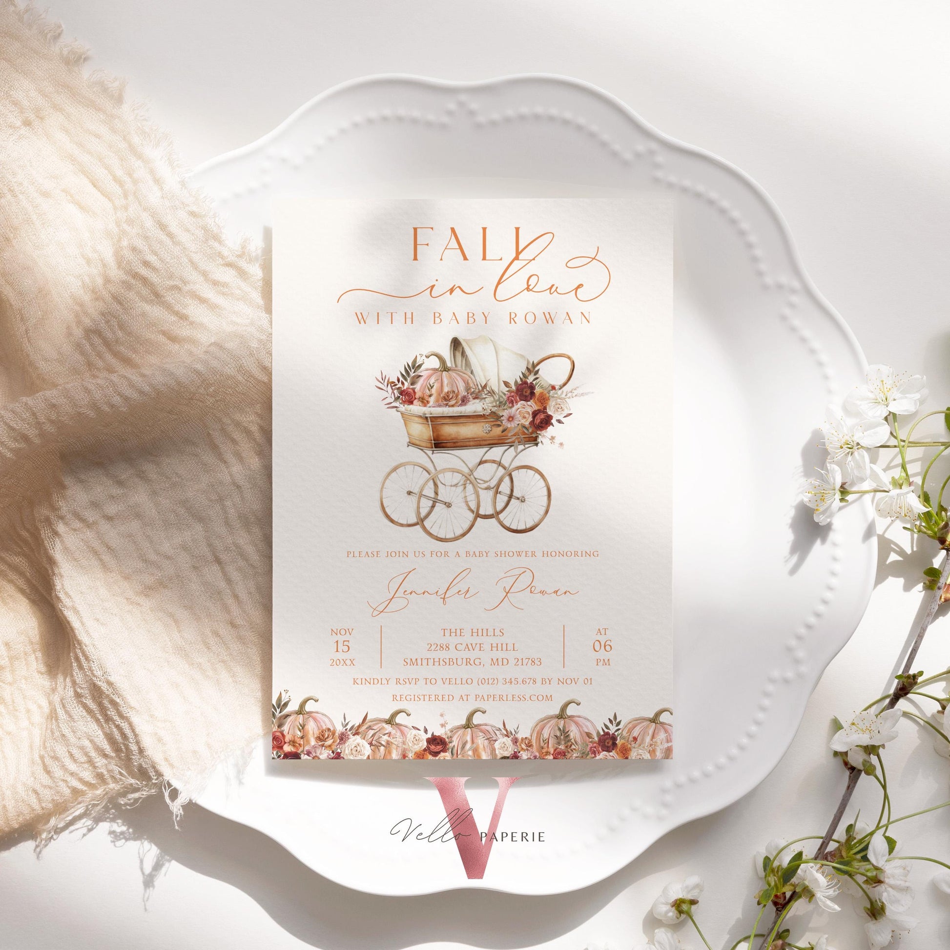 Pumpkin FALL IN LOVE Baby Shower Invitation | Autumn Floral Pumpkin Baby Shower Invite | Modern Baby Stroller Carriage Pumpkin Baby FPB02