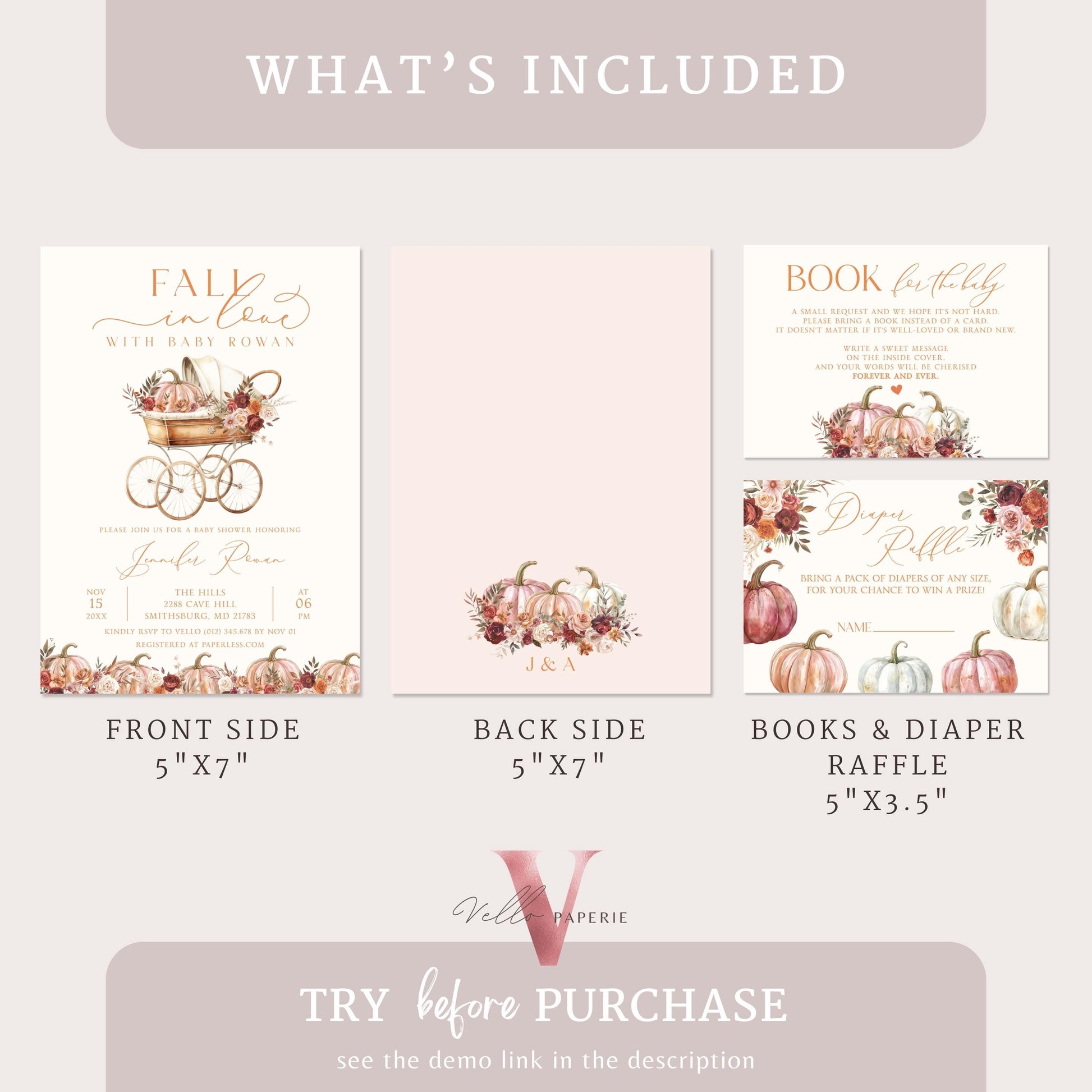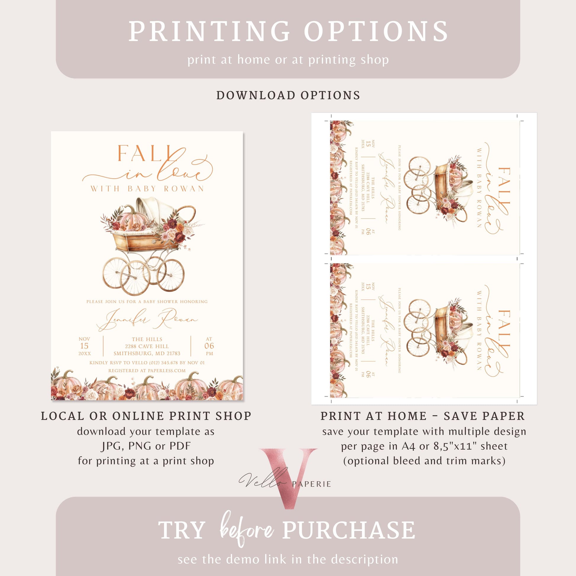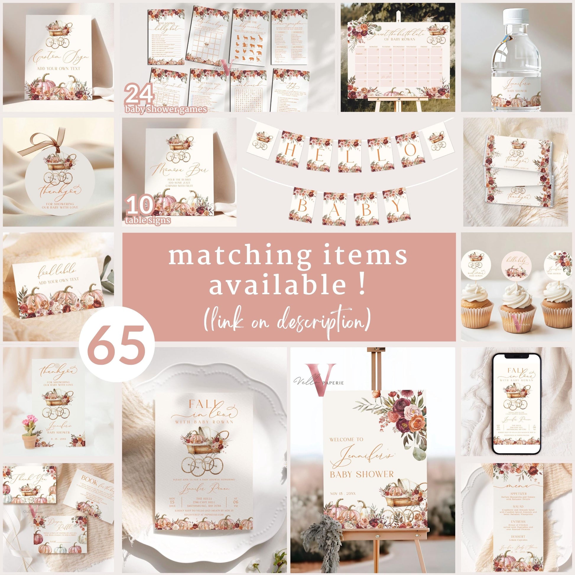 Pumpkin FALL IN LOVE Baby Shower Invitation | Autumn Floral Pumpkin Baby Shower Invite | Modern Baby Stroller Carriage Pumpkin Baby FPB02