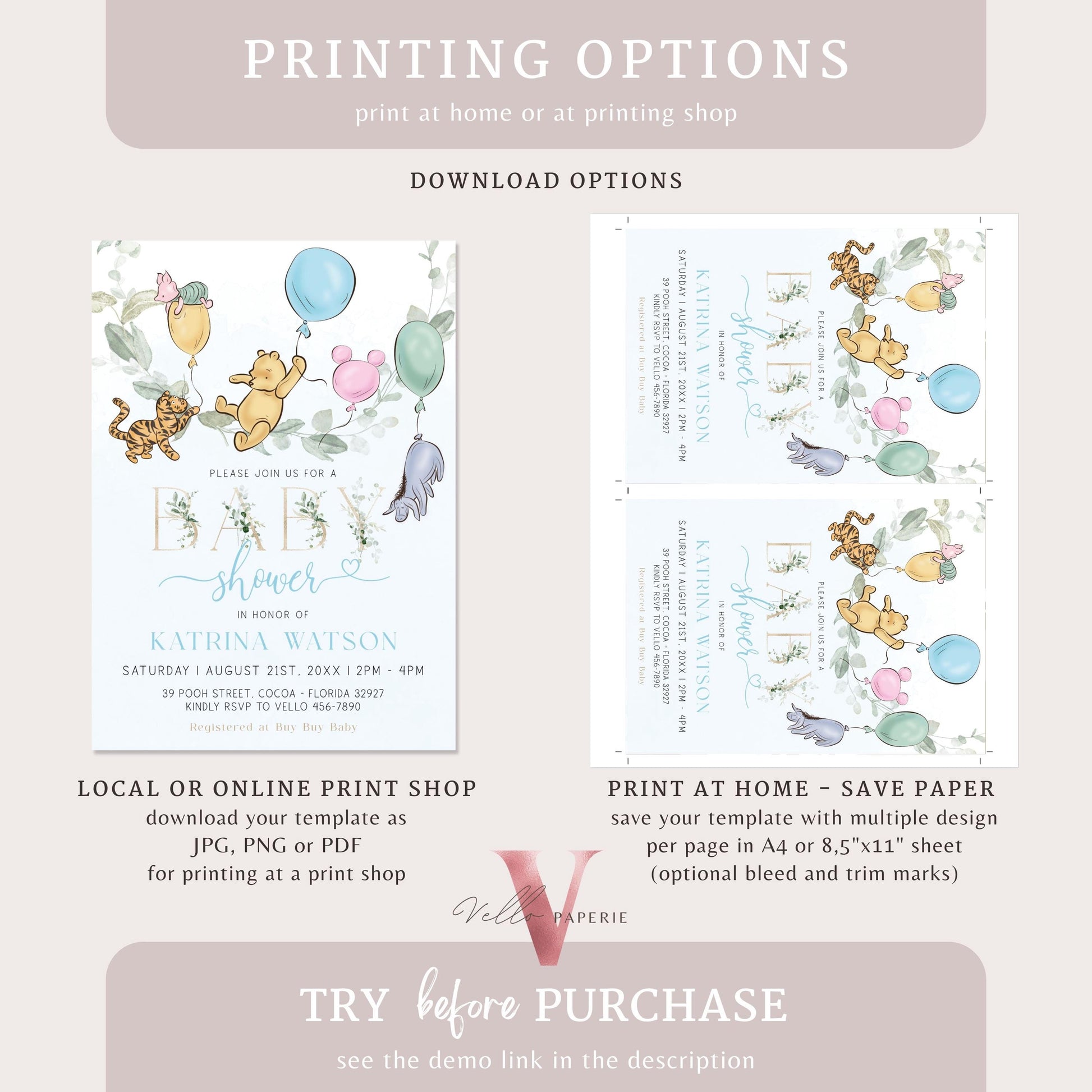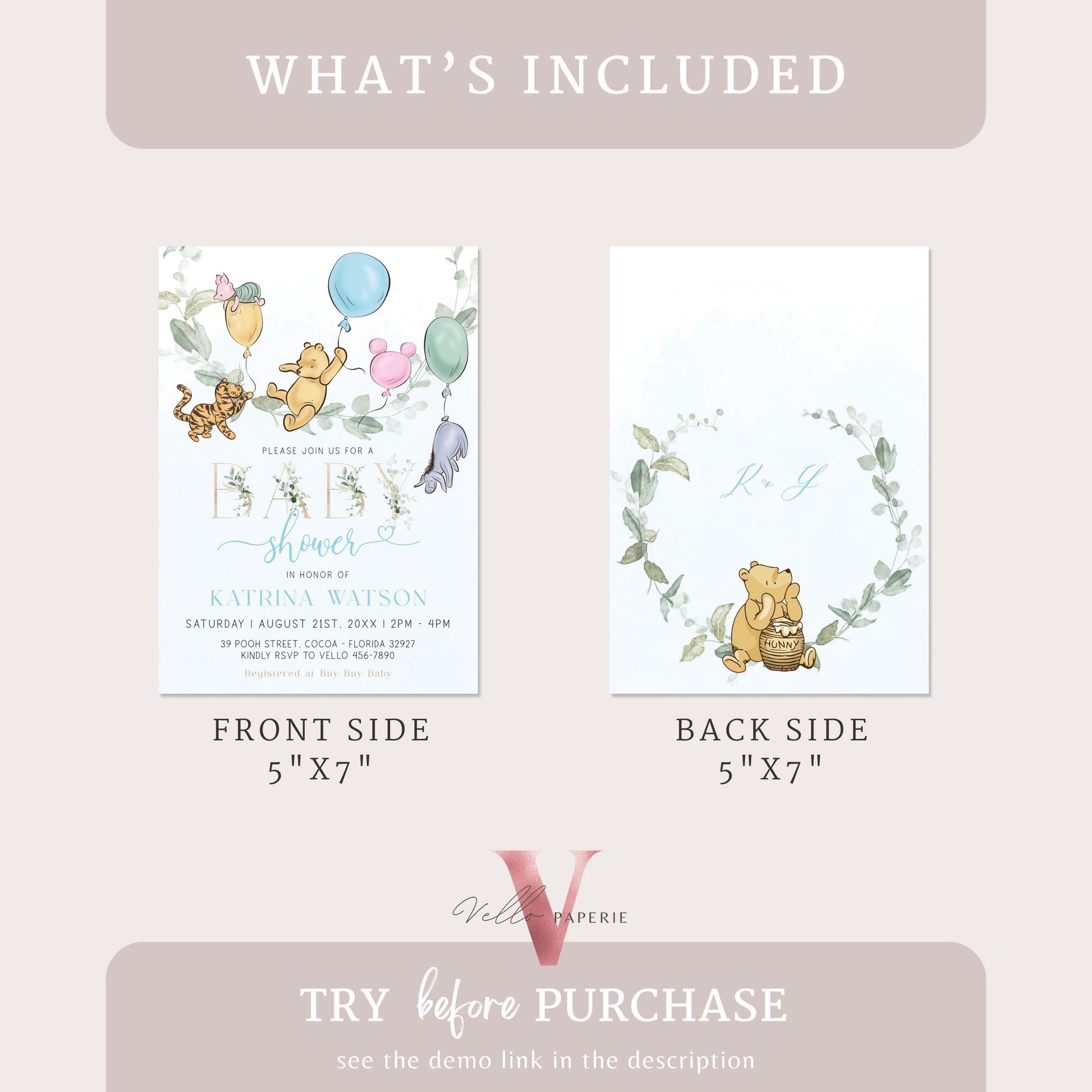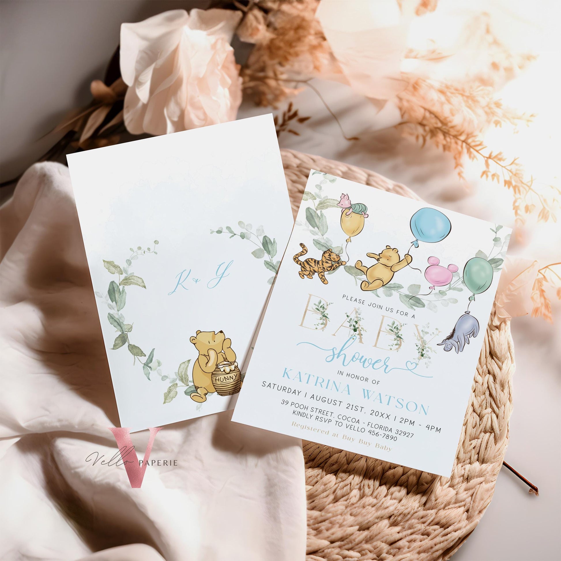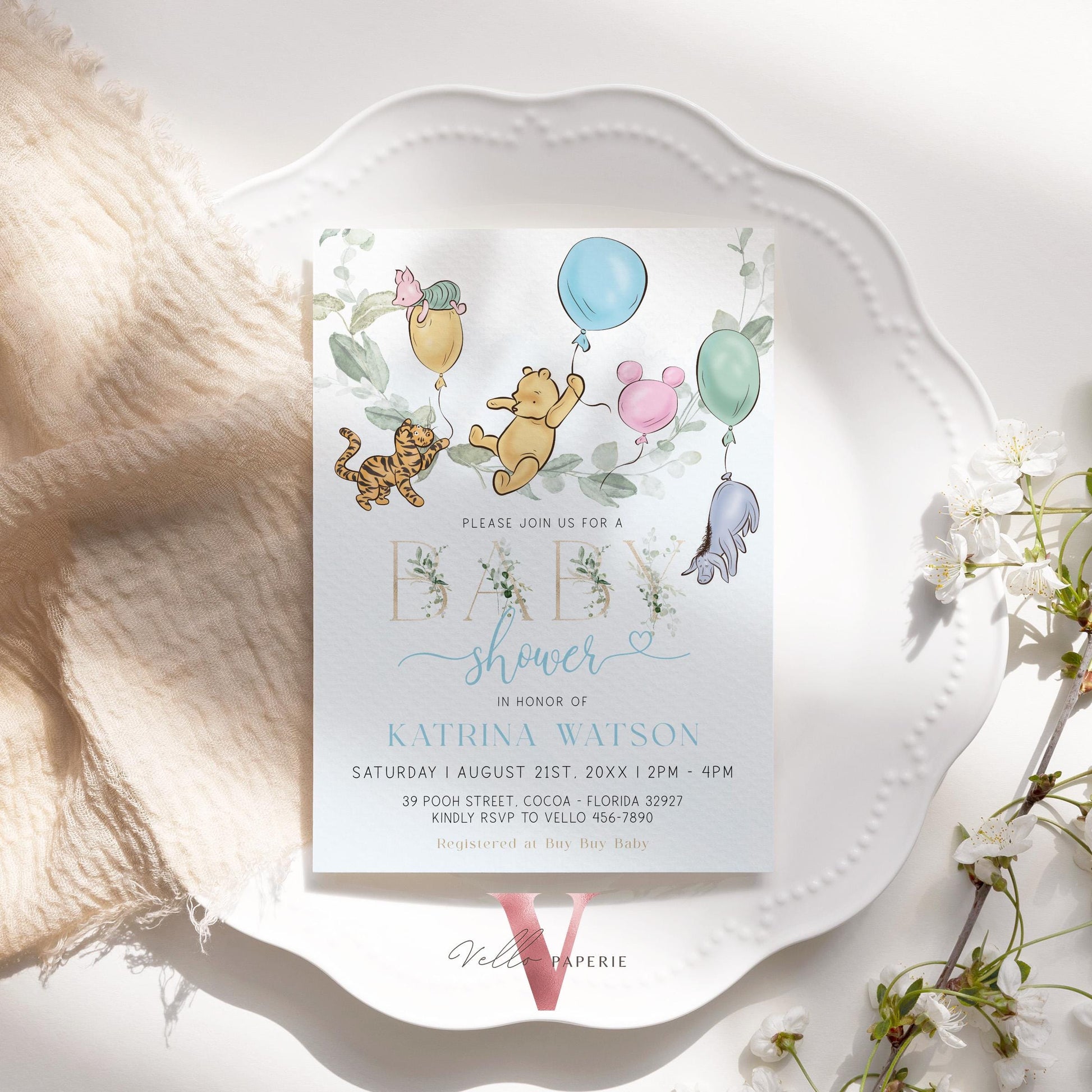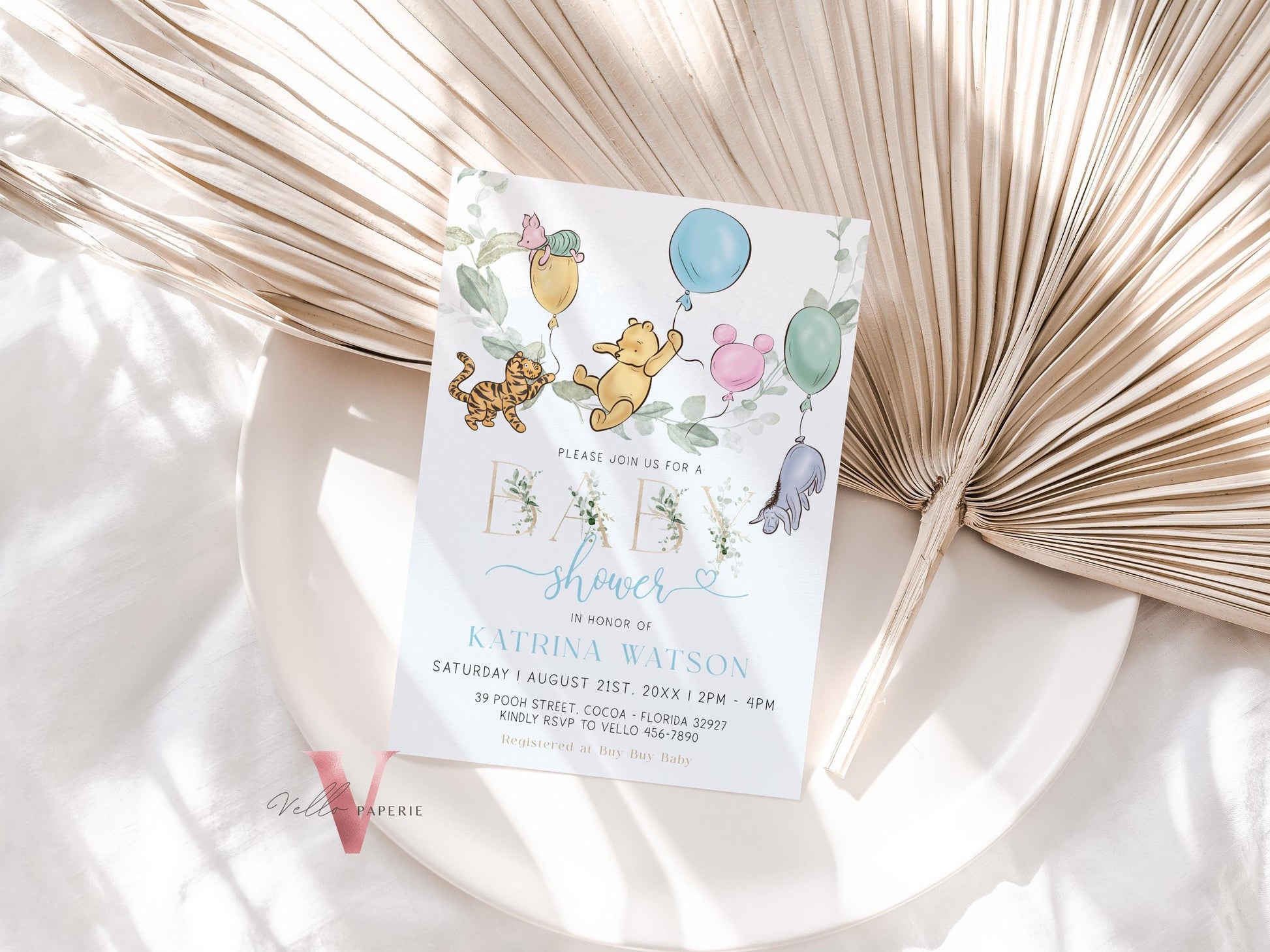Soft Blue Winnie the Pooh Colorful Balloon Baby Shower Invitation | Editable Printable Blue Greenery, Bearly Wait Baby Shower Party Invite