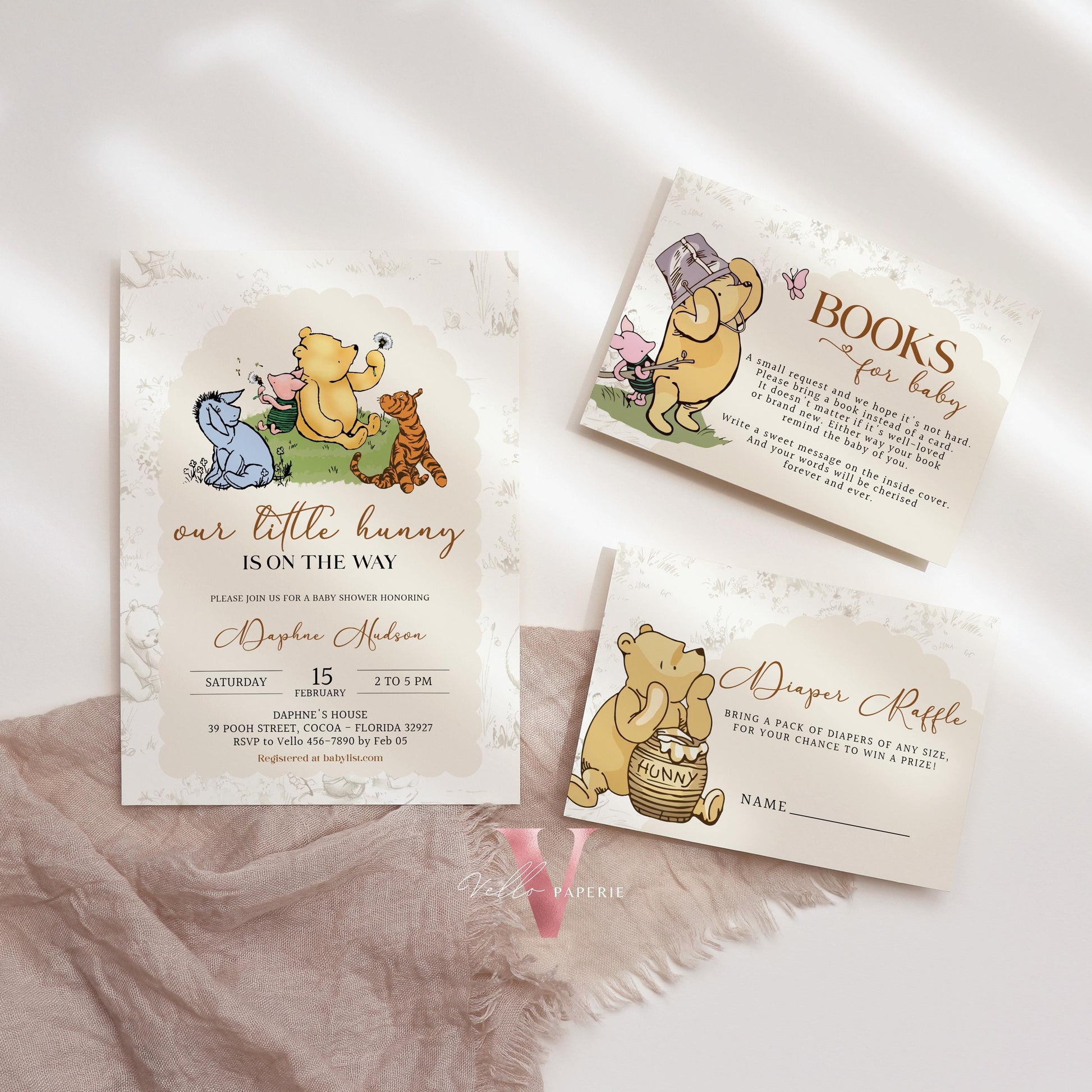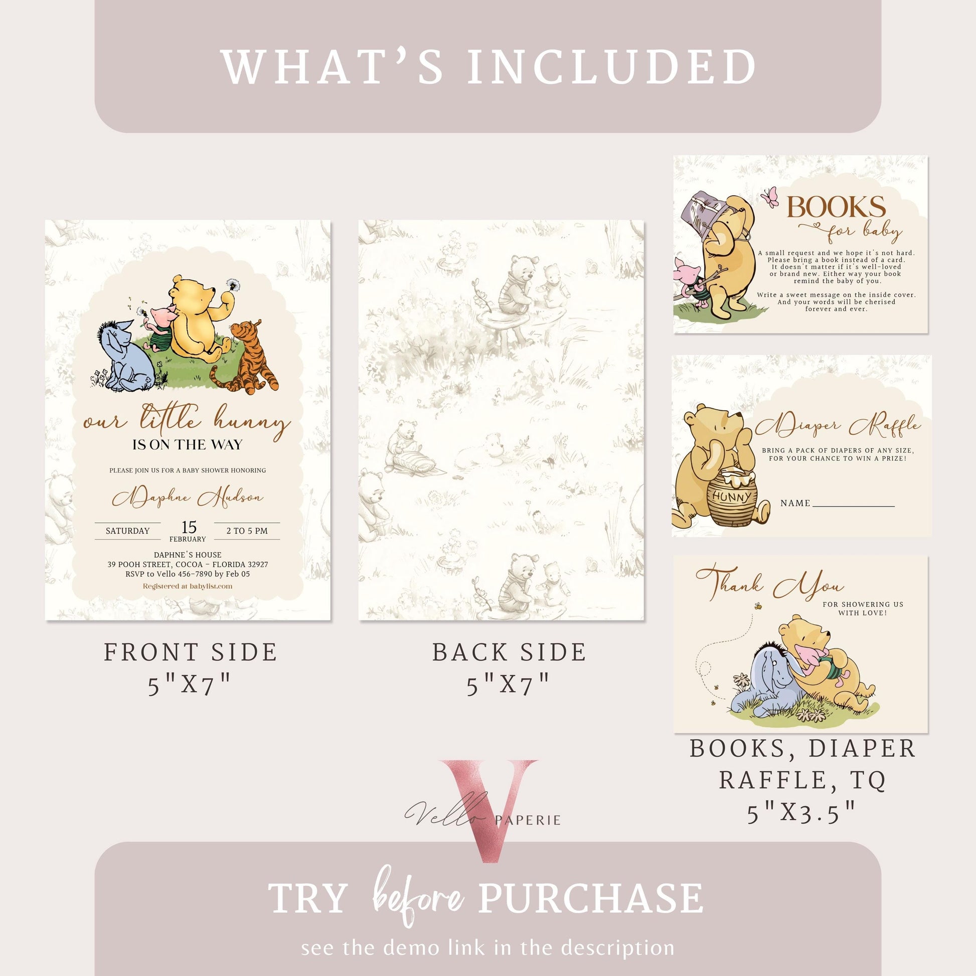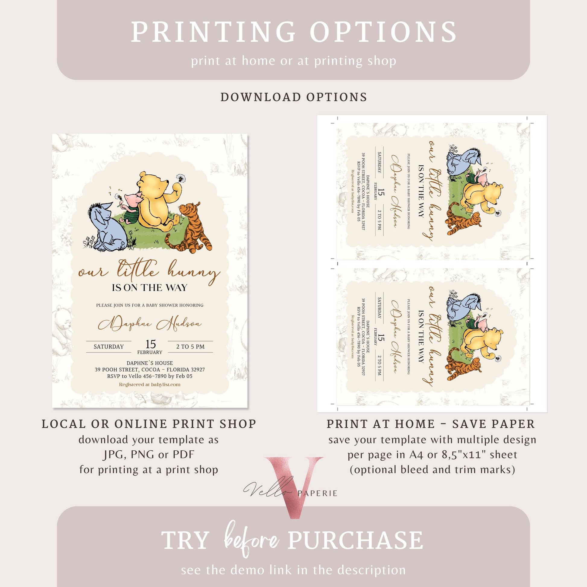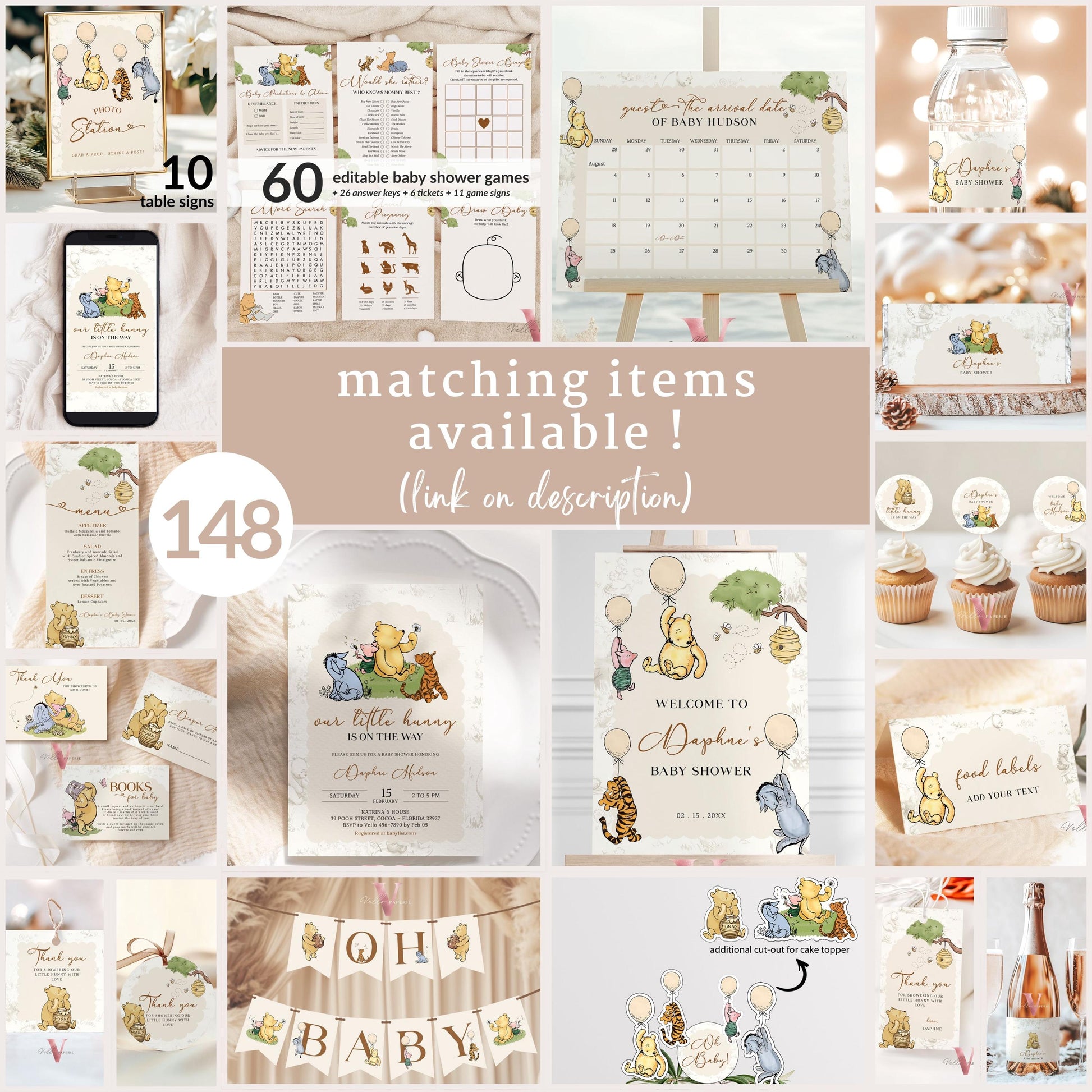 Winnie the Pooh Baby Shower Invitation Bundle | Editable Printable Beige Toile de Juoy, Little Hunny Pooh Baby Shower Party Invite WTP01